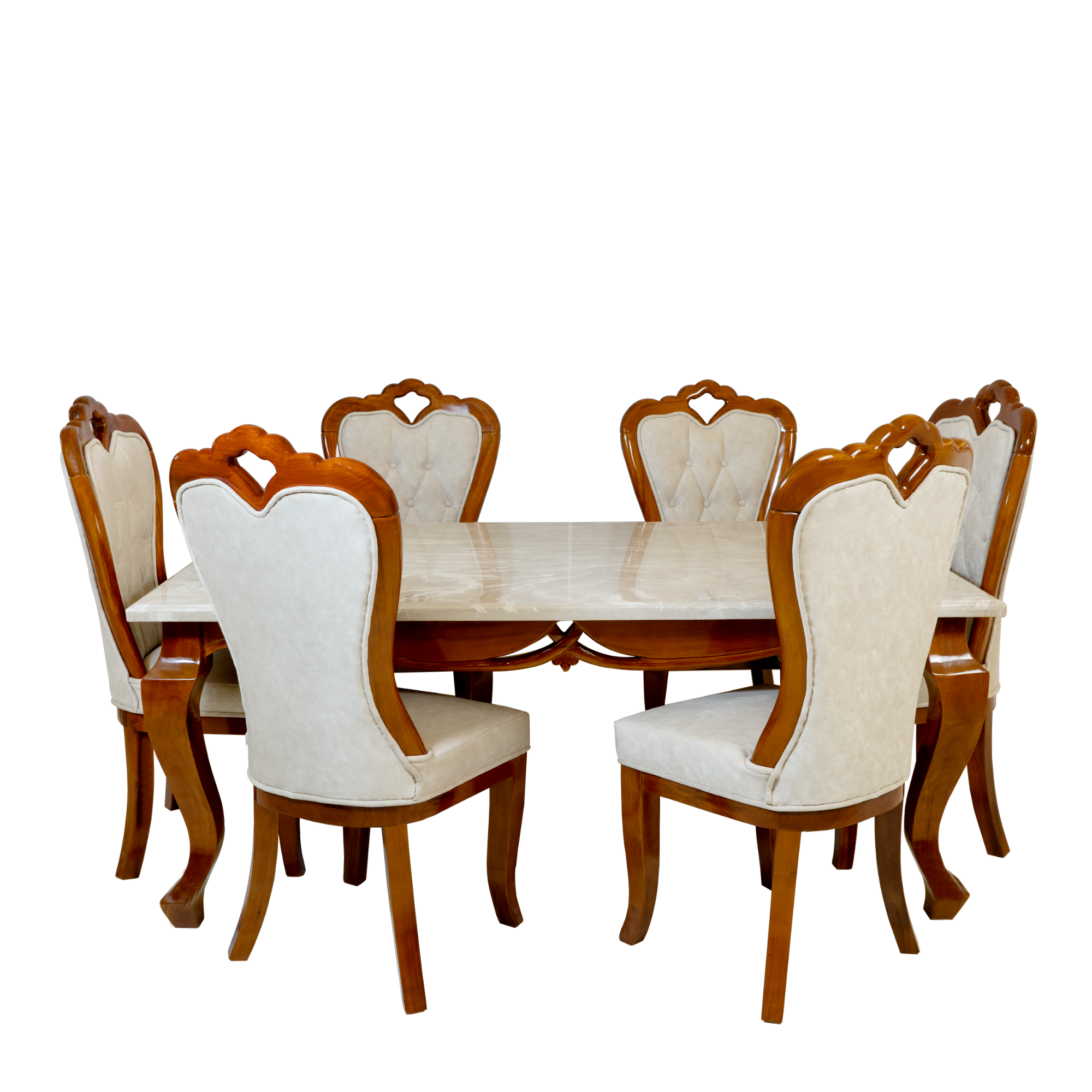 The MARVELOUS Top Marble Dining Table is crafted with high-quality Segun wood and a luxurious marble top, ensuring both durability and a timeless aesthetic.